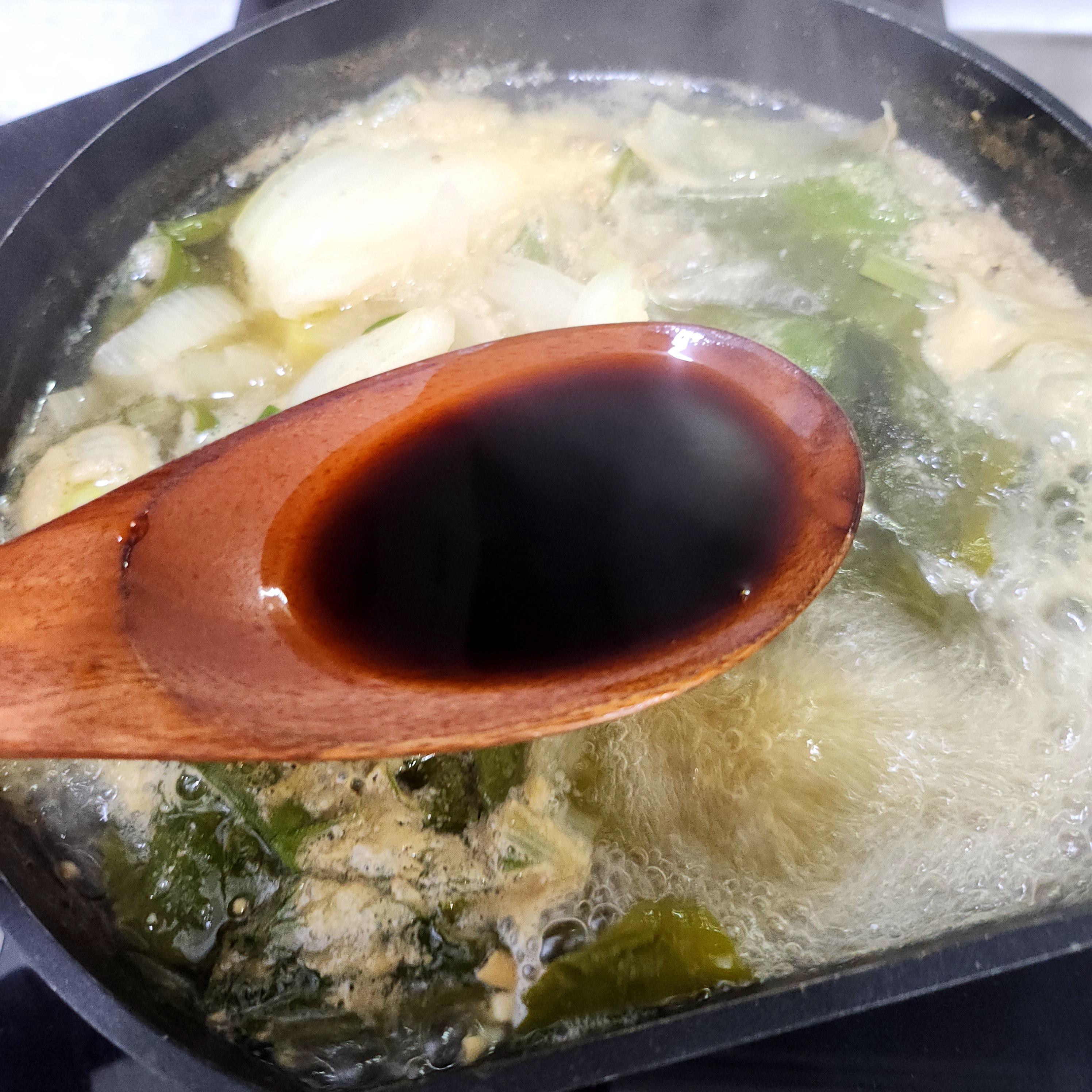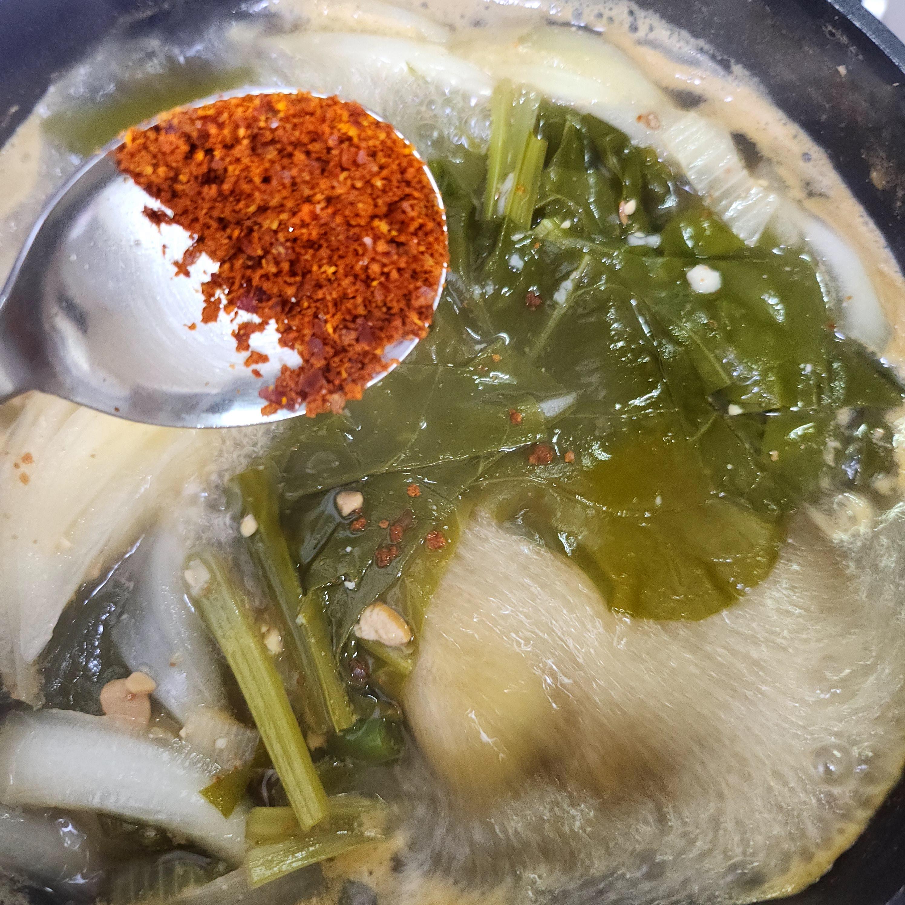 step4. 멸치액젓 2, 간장2, 고춧가루 1/2 으로 국에 감칠맛을 더하고 소금으로 입맛에 맛게 간을 더해주세요.