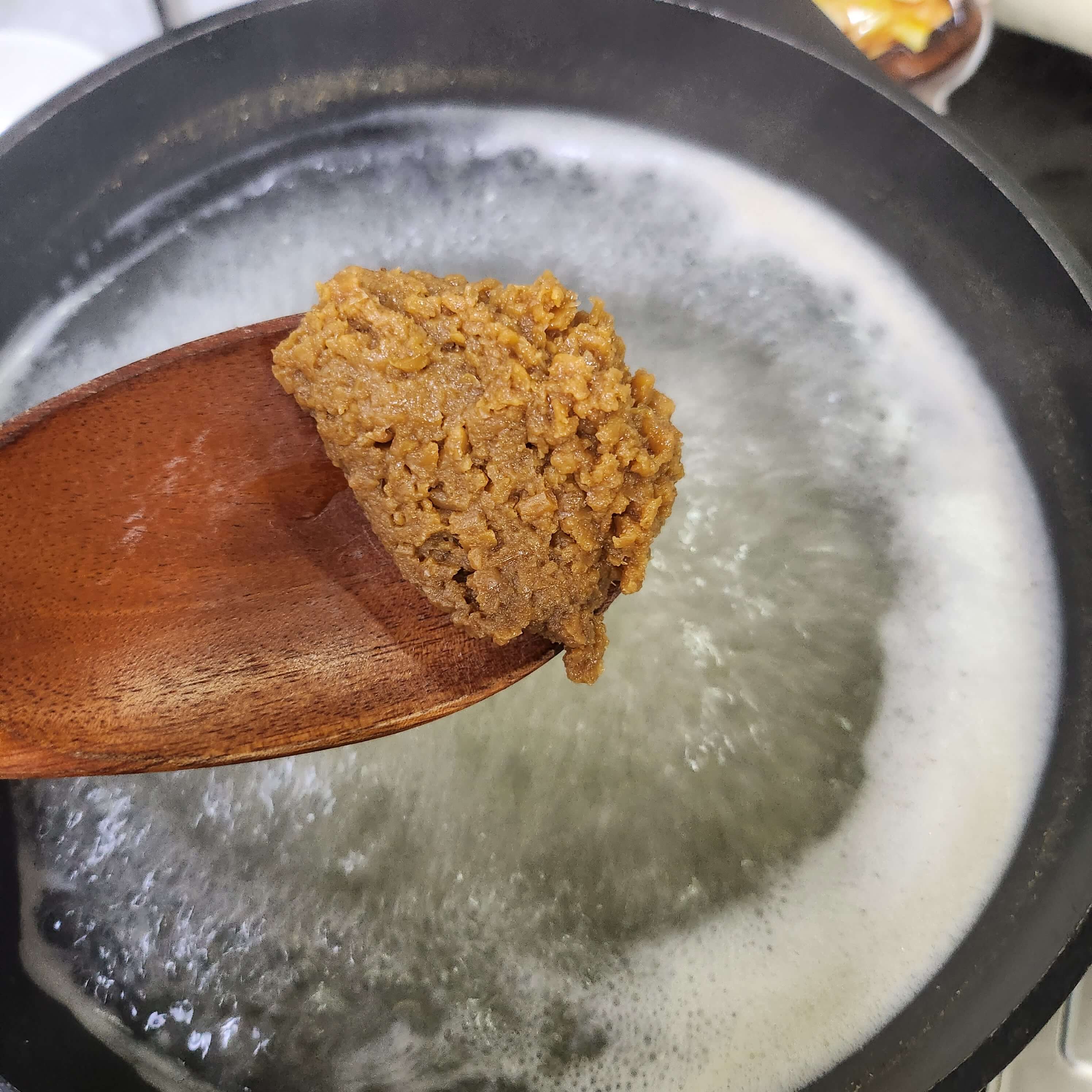 step 1, 준비해된 육수에 된장 세 큰술 넣어주세요.