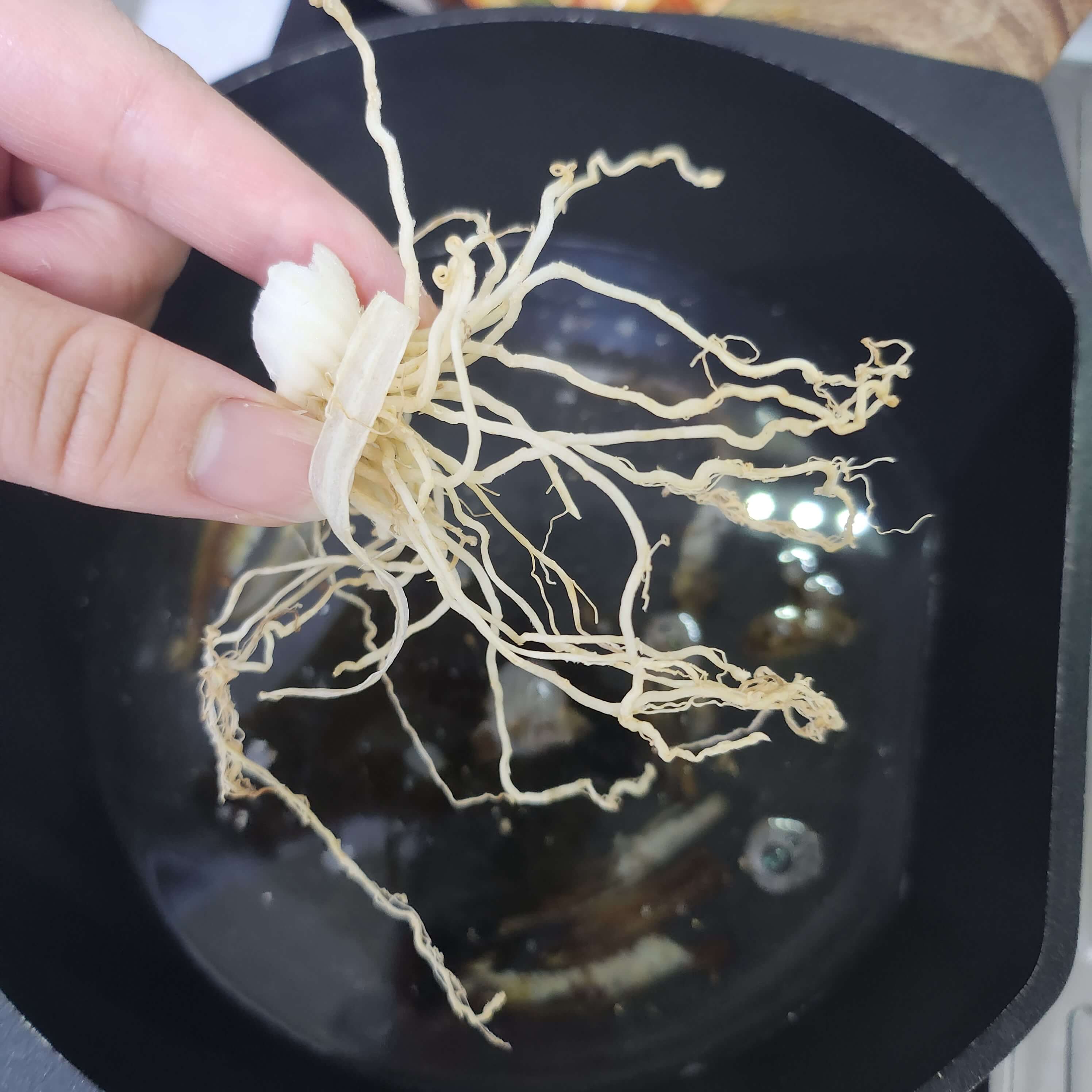 양파껍질을 대체해서 손질해서 얼려둔 대파뿌리를 넣어줬어요.
