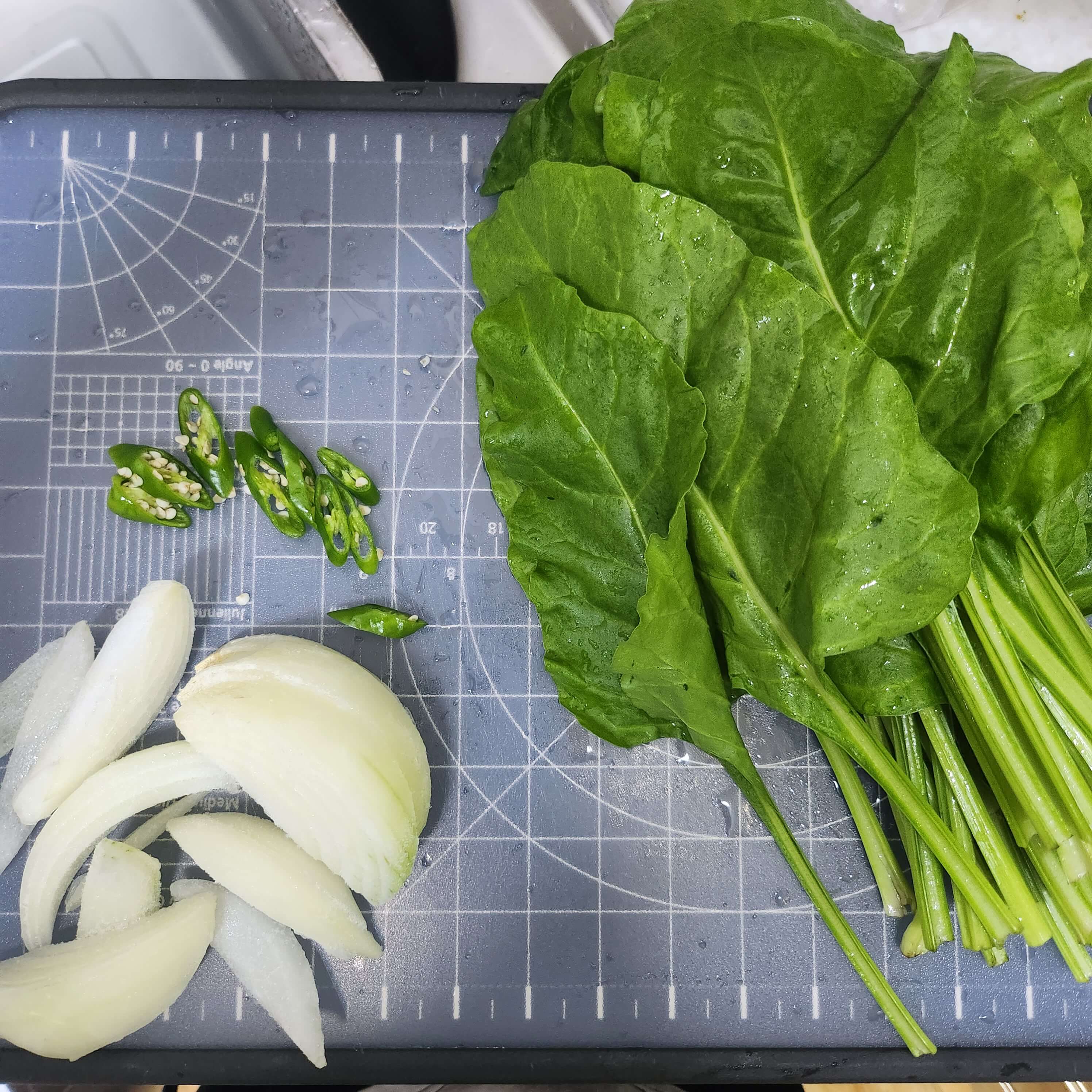 양파는 채썰기, 고추는 어슷썰기, 대파는 송송송, 근대는 세척후 눕혀 네등분 정도가 적당하더라고요.